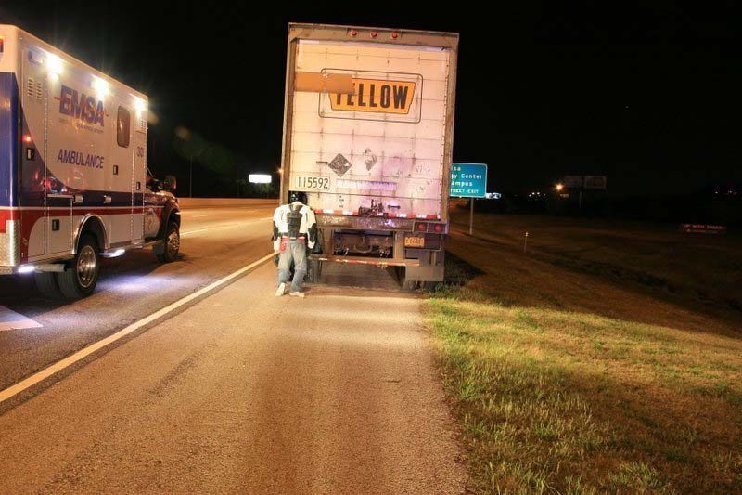 The Truck Driver said he thought he felt the impact, but it took him almost 4 miles down the road before he thought he'd better pull over and check out his rig.